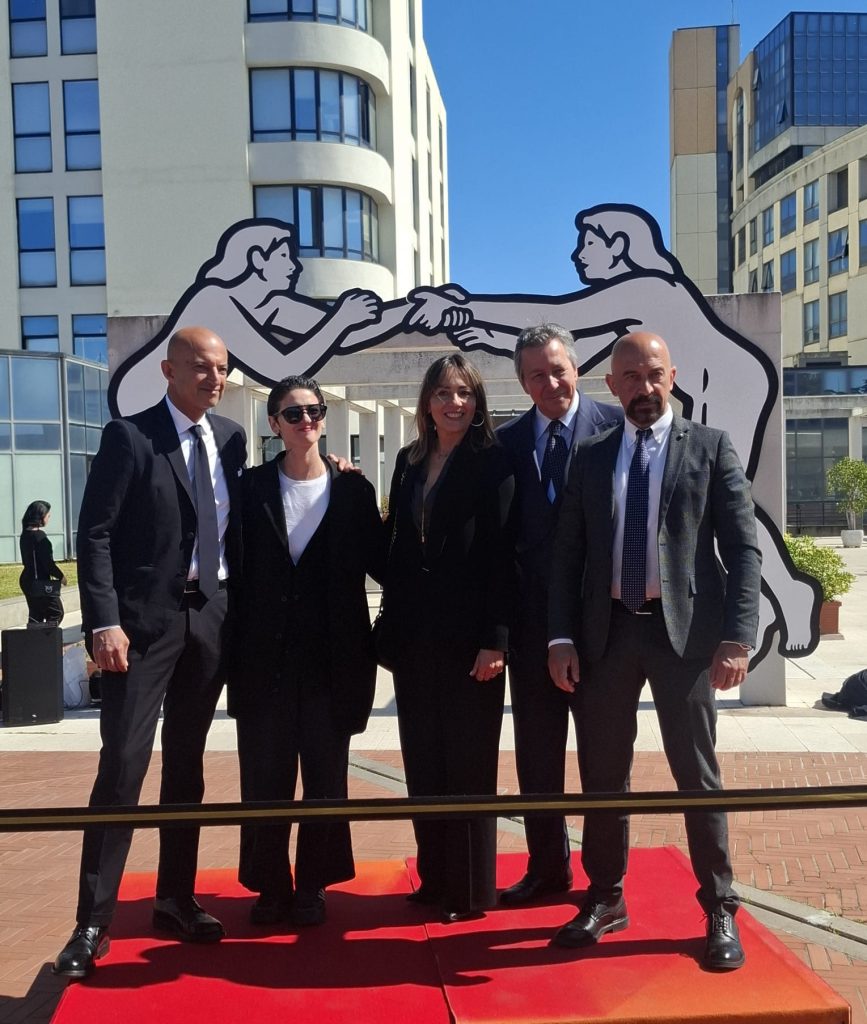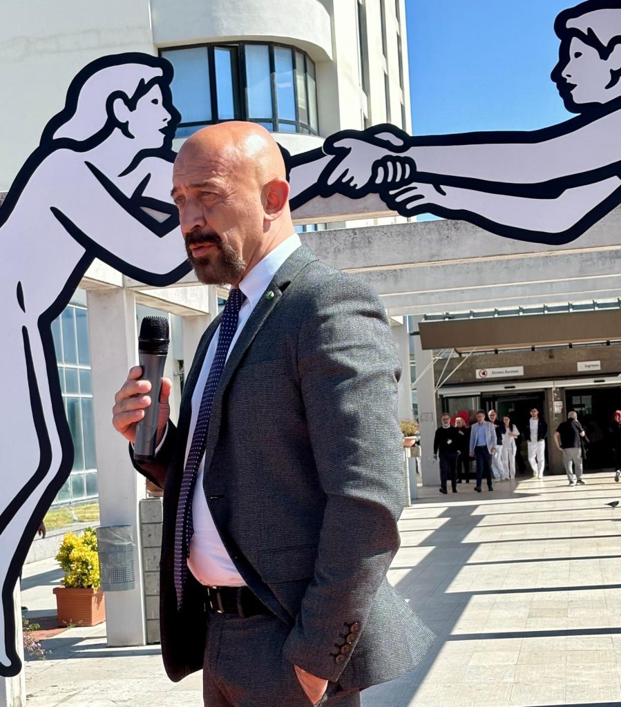 Nella settimana della salute della donna, da sempre figura centrale nei percorsi di cura, è stata svelata l’opera dell’artista MP5, “Uno Uno”, che rappresenta l’incontro tra persone, vicinanza e protezione reciproca, un invito a riflettere sul valore della relazione come fondamento della cura. È posta all’inizio del colonnato dell’ingresso principale perché quando una persona entra in ospedale, porta con sé preoccupazioni, paure, aspettative. Se quello spazio attraverso il linguaggio dell’arte trasmette accoglienza, relazione, prossimità, allora cambia la percezione stessa della cura che diventa un’esperienza più ampia.